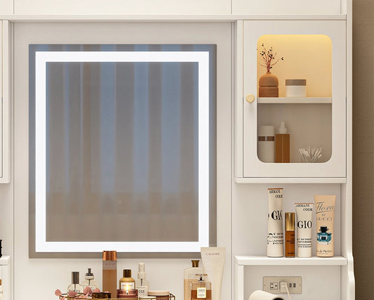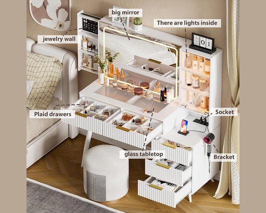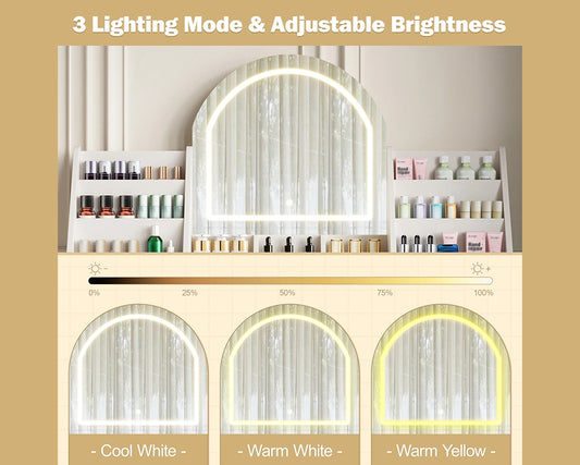 Adjustable LED Mirror Vanity Desk with Hidden Storage & Drawers