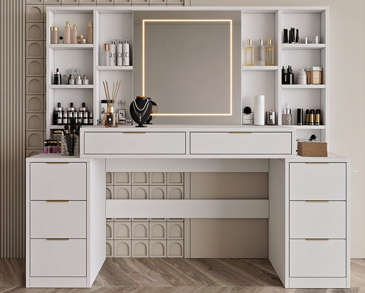 Large Vanity Table Set with Mirror, 6 Drawers & Shelves