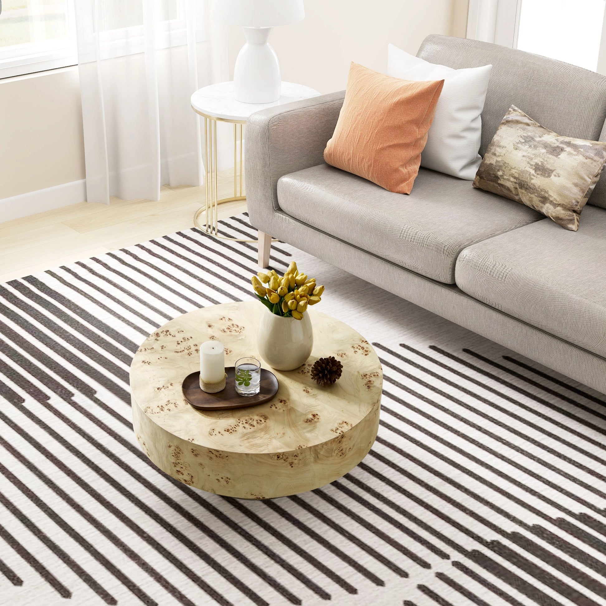 Round Coffee Table, 31.49-inch Mid-Century Modern Design with Burl Wood Veneer Top