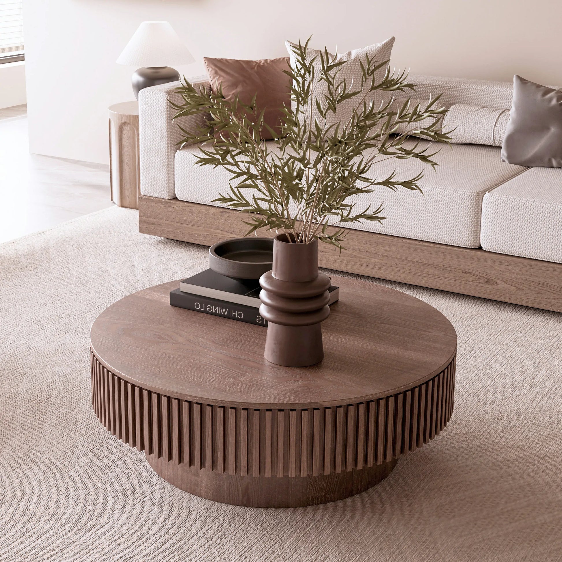 31.5'' Round Coffee Table with Storage Solid Wood Veneered