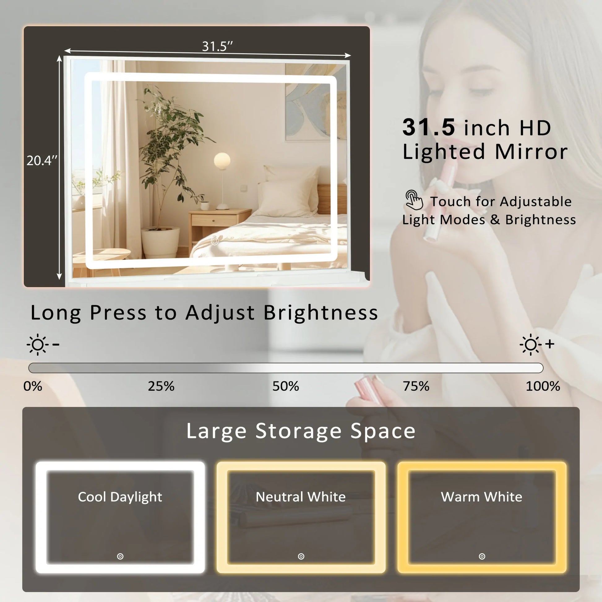 Modern LED Mirror Vanity Table with Adjustable Storage & 3 Light Modes