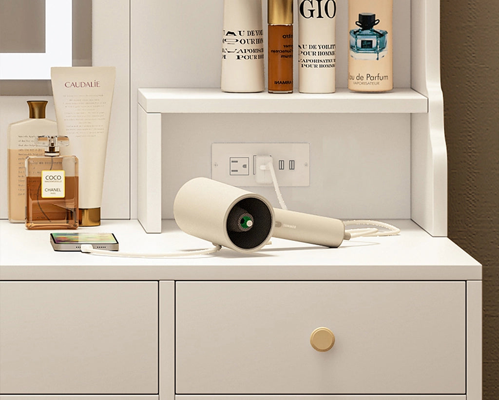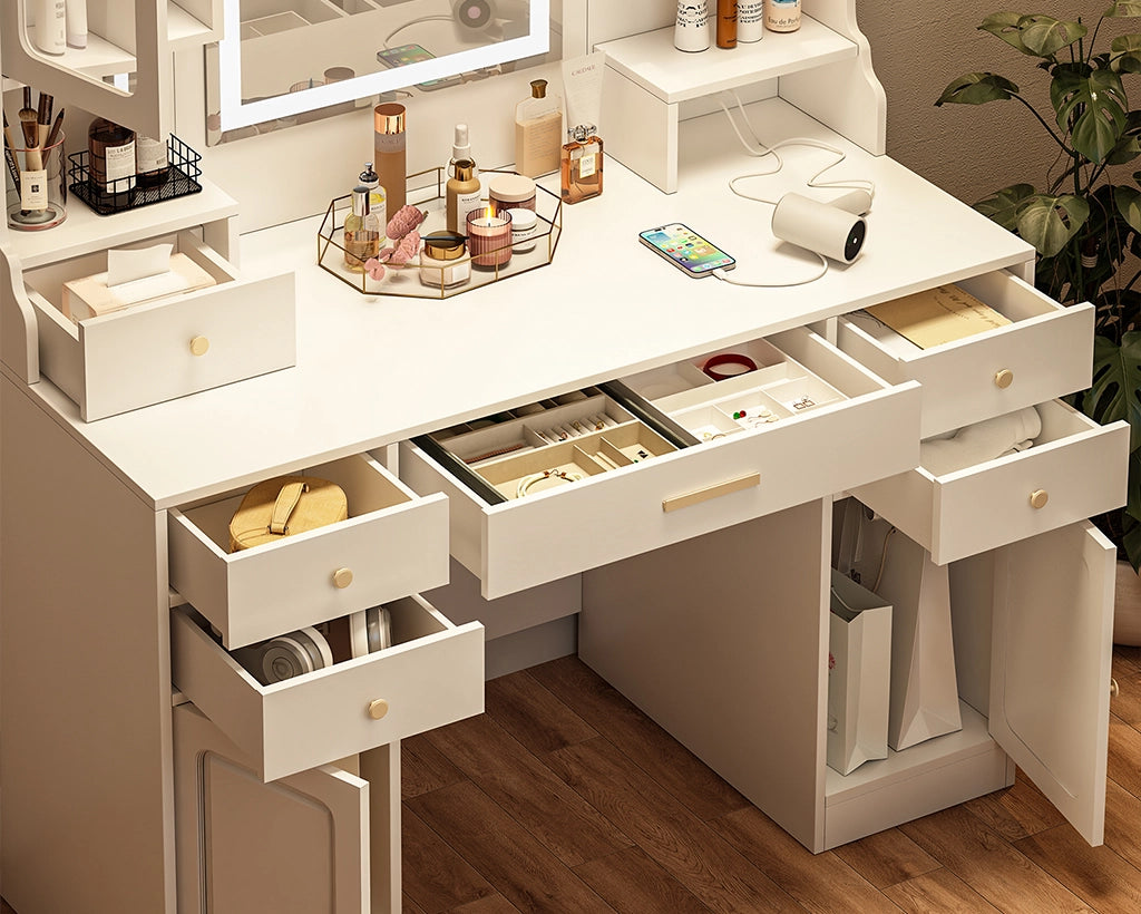 This vanity features six drawers and four storage cabinets, allowing for systematic organization of all your beauty essentials and accessories. The spacious tabletop can also accommodate a laptop or office supplies, and is equipped with a power strip featuring two standard AC outlets and two USB ports, allowing you to power and use electronic devices directly on the tabletop. These thoughtful details transform it into a versatile workstation, saving valuable room space and offering convenience whenever you need it.