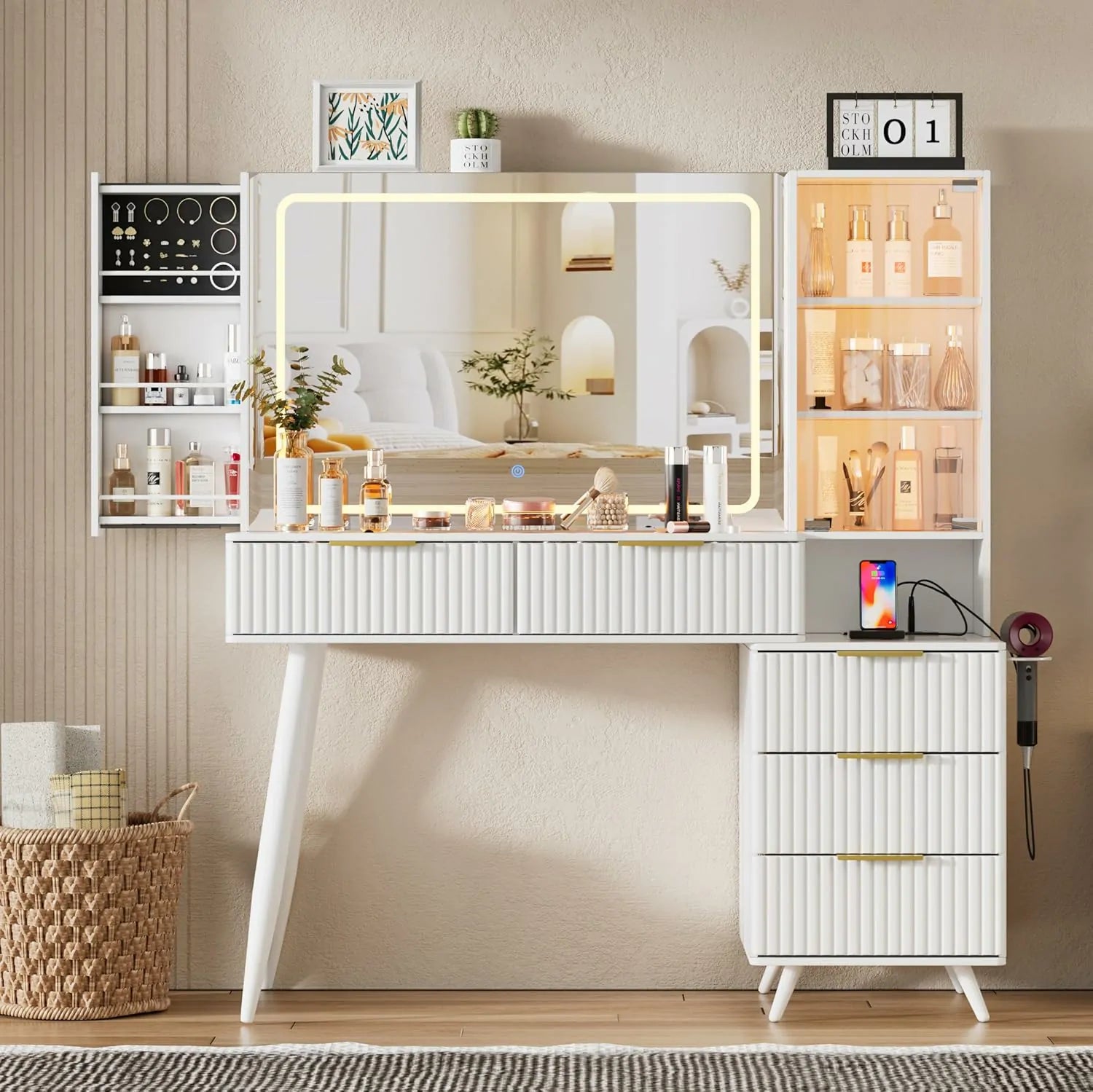 Makeup Vanity Desk with LED Mirror, Glass Top & Drawers - White