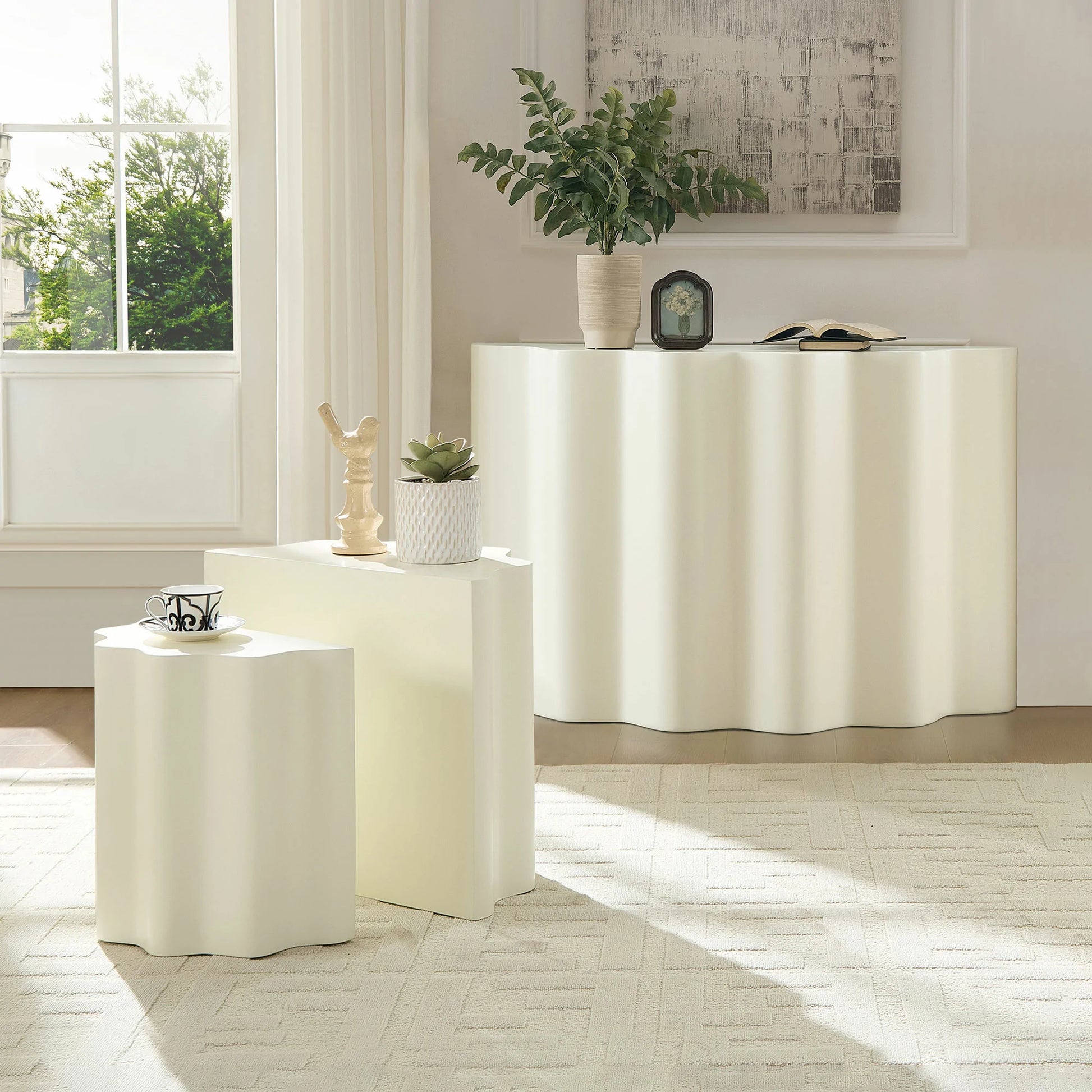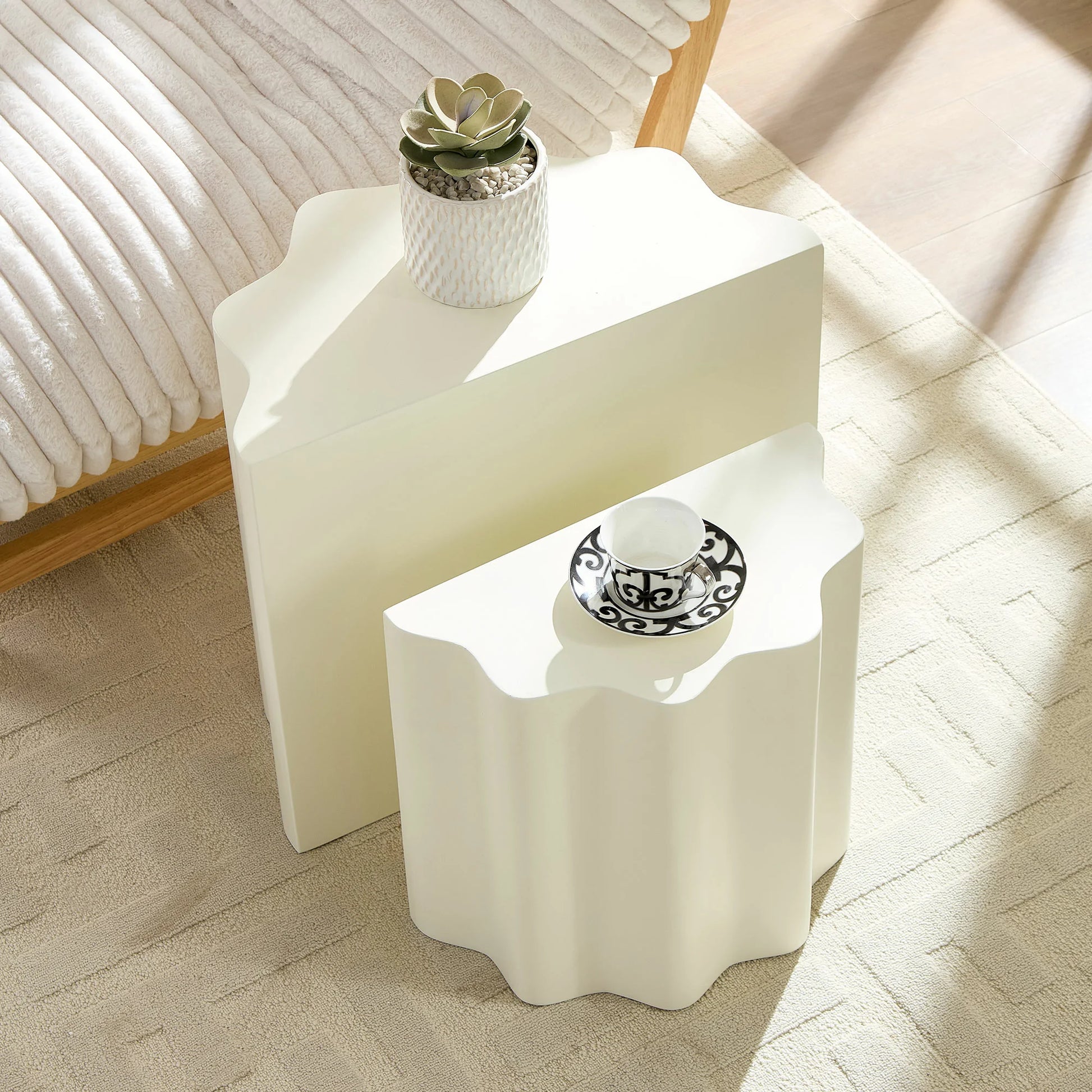 Features special wavy edges that transform simple tables into minimalist sculptural pieces. The flowing lines add subtle visual interest while maintaining timeless, understated elegance.